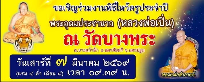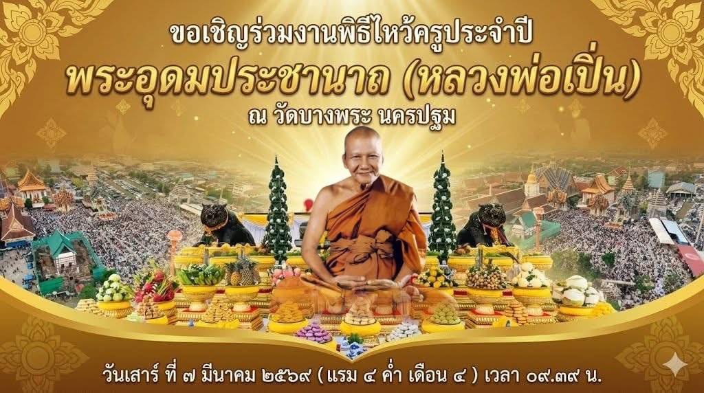 ขอเชิญร่วมงานพิธีไหว้ครูประจำปีพระอุดมประชานาถ (หลวงพ่อเปิ่น) ณ วัดบางพระ วันเสาร์ ที่ ๗ มีนาคม ๒๕๖๙ (แรม ๔ ค่ำ เดือน ๔ ) เวลา ๐๙.๓๙ น.